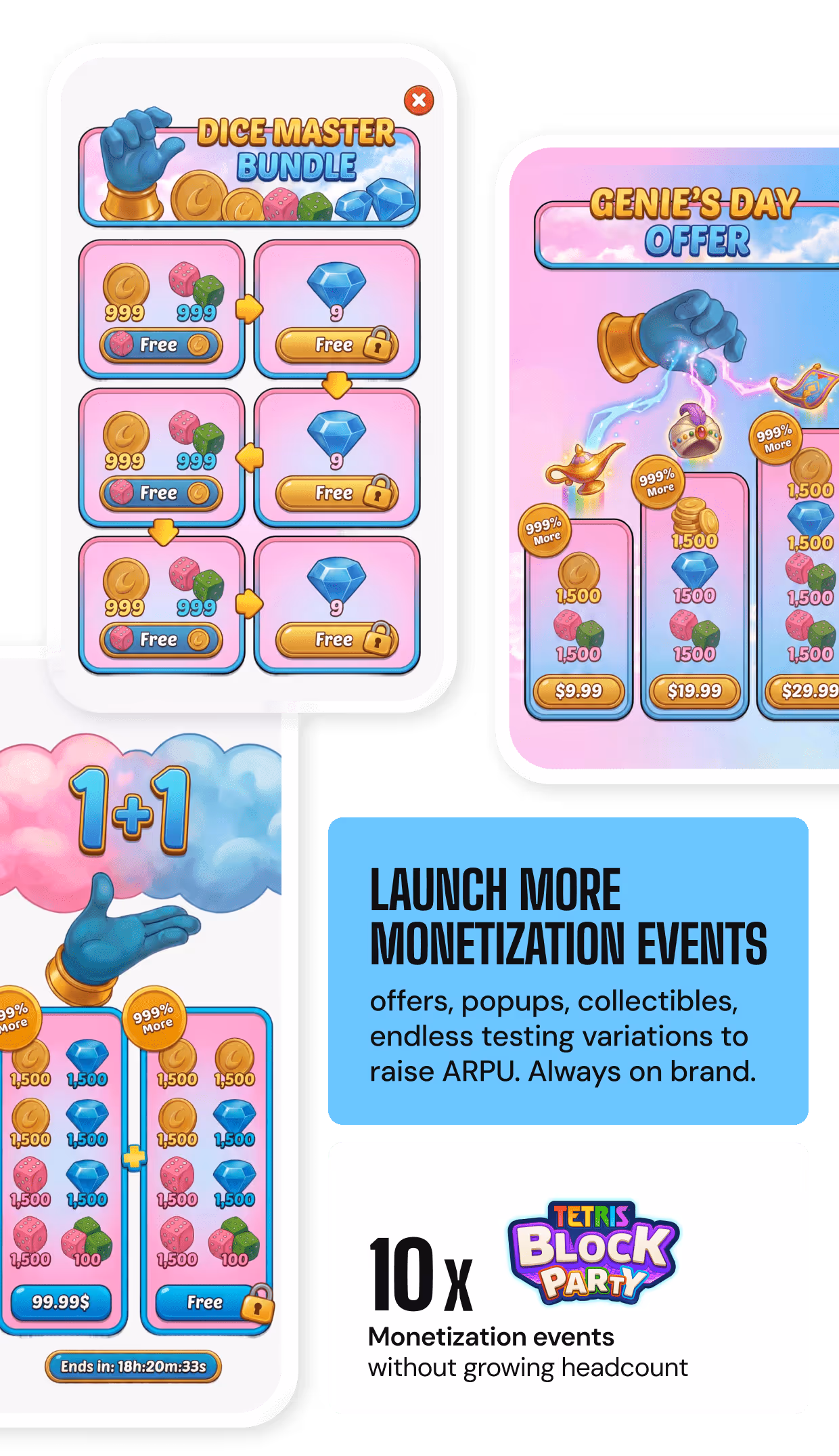 Offers, popups, collectibles, endless testing variations to raise ARPU. Always on brand.